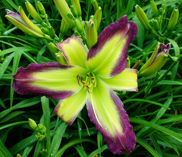 (Patrick Starfish) x (Emerald Starburst) Flowers of Batgirl are maroon purple with a very large green throat. For many years I disliked nocturnal daylilies because they start opening the night before and lose color by noon and close up by late afternoon. Living in the north we have cold nights, 50 degrees F sometimes. As a result flowers open poorly, the pattern daylilies seem to be the worst. I wanted a daylily that was perfect in the mornings after a cold night but yet take the high heat and still look good at 8 PM. Everyone said could not be done. However with this new line from Patrick Starfish and Emerald Starburst I got what I was looking for. Batgirl,Chasing Your Dreams, Money Maker and Stargirl are the first of many future generations which corrects for this problem in the north. Soon we will have broken patterns around the edges as a result of the eye zone becoming the edge, which can be the patterned part of the daylily. Pattern Breaker crossed to Batgirl and Money Maker are a good starting point. Because the substance and color saturation is so good in Batgirl,Chasing Your Dreams, Money Maker and Stargirl, it takes a very good broken pattern breeder to give you want you want. Batgirl and Money Maker are great to take to narrow flowers and Stargirl and Chasing Your Dreams to the round ones. I have used both ways and gotten what I was looking for. A super good parent for hybridizing large patterned daylilies. Batgirl is super pod fertile. Pollen is great to, but you can set so many pods why even use the pollen. LoL.......$100 sfan