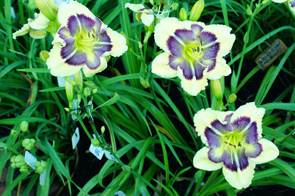 Blue Perfection (Shasta Blue Butterfly) x (Super Fancy Face x Texas Kaleidoscope) Diploid 30" Mid season Dormant emo fr 5.5" 3-4 way branching 18-22 buds. Fertile both ways. Rebloomer. Very good rust resistance. Northern Hardy. Flowers of Blue Perfection are cream to near white with a multi-colored patterned eye zone of blues, violet, purple and maroon. The throat is very green throat. The petals, sepals and edge are patterned. The eye zone is very blue. I believe it to be the bluist DORMANT full formed diploid introduced todate. A super good parent for hybridizing large blue patterned Daylilies. As you can see from pedigrees below, lots of blue eyed parents, but all evergreen. Blue Perfection is an very important parent for blue....$200 sfans Alien Butterfly, Blue Perfection and Blue Bubble stand out in the current introductions of most of what coming out this year. Hardy none are dormant. And the biggest fault is all the pinching in the throat and flowers are soft. A super hard trait to breed out. Not so bad in narrow flowers but not a good trait in round. These flowers open back, super important for cold night opening. If a southern flower shows just a little of this trait it will be worst in the north. If you cross with these and or Chasing your heart, you can correct for this right away in next generation.
