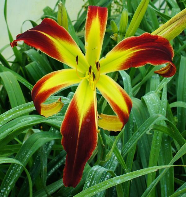 (((Heavenly Lasting Impressions x Webster's Red Knight) x (Megatron)) x (Tetra Great Red Dragon) Flowers of Optimus Prime are red with a very green throat. A small white edge goes around the petals. Registered as a large flower to show in the large flower class like it's parent Megatron. First introduction out of my tetra Great Red Dragon. A very good parent for mega sized daylilies......$35 DOUBLE FANS.