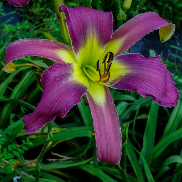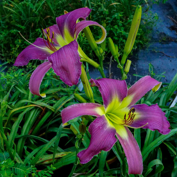 So Delightful (Torpedo Fish) x (Papa Smurf) Seedling number Camt7302stkpmf Tetraploid 38" Mid Late Season Dormant emo fr 9 1/2" 4-5 way branching 22-28 buds. Unusual Form Type : Crispate. Fertile both ways. Rebloomer. Very good rust resistance. Northern Hardy. Flowers are lavender purple with a darker eye zone and green throat. Every once in a while there comes a daylily that has to be seen to be believed. So Delightful is one of those. This flower takes the best of her parents, Torpedo Fish and Papa Smurf, and just Vaults past them in looks, plant habit, performance, everything. Her color is very difficult to photograph. There is purple, and then there is PURPLE. This girl glows so much she is almost a florescent purple in the garden. A 9.5" flower on sturdy, well-branched scapes, her form and color saturation is impeccable. She ALWAYS delivers. If you love purples, you need this flower.....$50 SF.