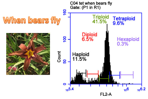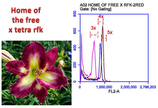 I bloomed a Home of the Free x tetra Rose F Kennedy cross in Florida, but it was dormant and did not do well, so I bought it home to Ohio. After separating 3 fans from a single clump of the plant (all fans generate from the same seed) I analyzed the ploidy of each fan. The results were that each of the three fans had different ploidy as follows: one each 3x = Triploid, 4x=Tetraploid, 5x =Pentaploid.